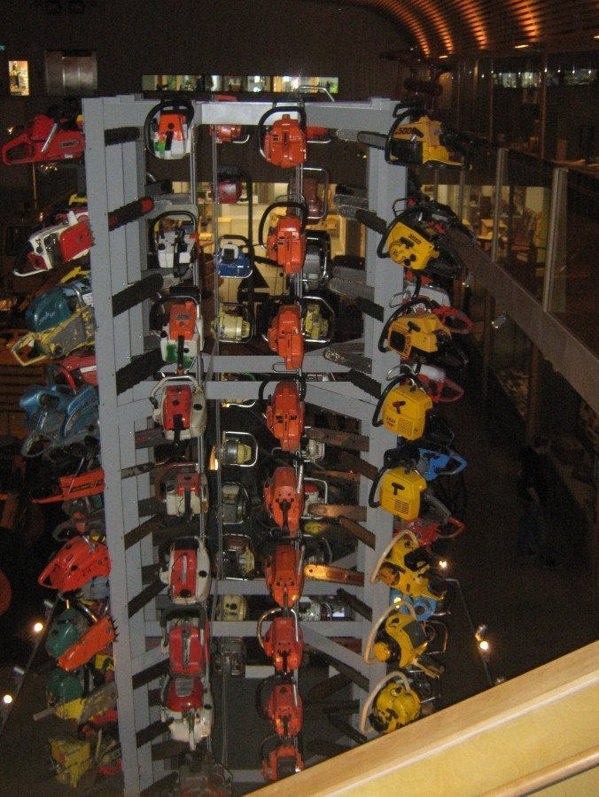 er merkilegt skógarsafn þar sem meðal annars má sjá þessar keðjusagir.
