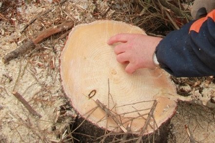 Rúnar Ísleifsson skoðar árhringina á stubbnum