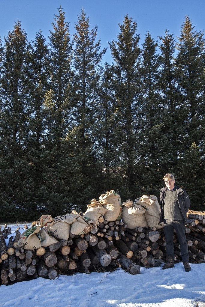 Aðalsteinn Sigurgeirsson við tvenns konar afurðir Daníelslundar, furuboli