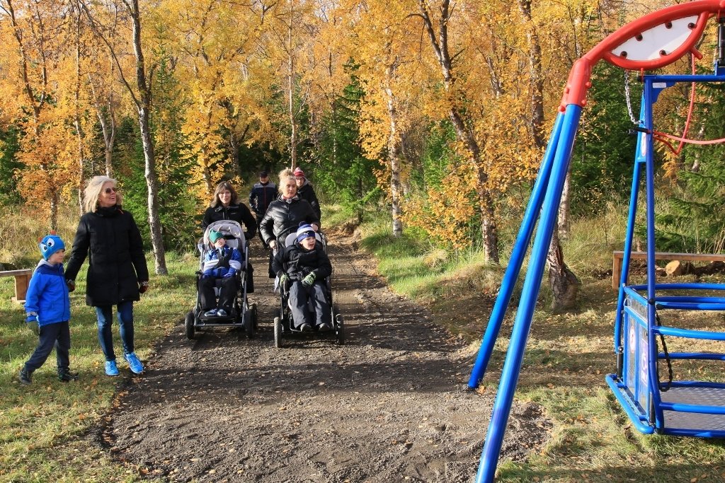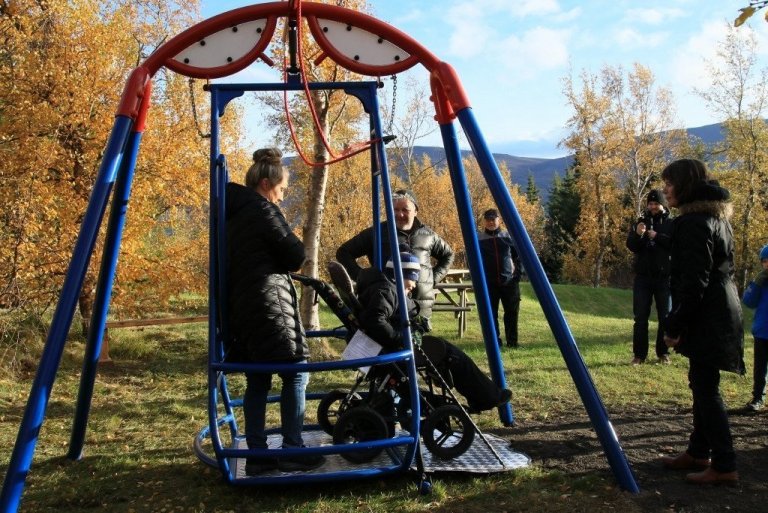 Í Kjarnaskógi á Akureyri hefur verið útbúið nýtt samkomusvæði með grillhúsi og leiktækjum í mjög fallegu umhverfi. Svæðið heitir Birkivöllur en auk myndarlegra birkitrjáa eru þar ýmsar fleiri trjátegundir, til dæmis falleg tré af gráelri og síberíuþin svo eitthvað sé nefnt. Í dag komu nemendur úr Giljaskóla ásamt kennurum sínum til að reyna hjólastólarólu sem sett hafði verið upp á Birkivelli.