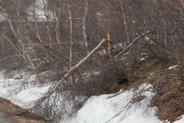 Rúnar Ísleifsson, skógarvörður á Norðurlandi, segir enn ekki hægt að segja alveg til um hvernig skógarnir í Fnjóskadal koma undan vetri enda er þar enn mikill snjór og ekki hægt að fara alls staðar um. Greinilegt sé þó að töluvert sé brotið undan snjó, sérstaklega yngra birki. Myndin hér til hliðar er af brotnu birki í Vaglaskógi. Barrviðurinn virðist líta vel út og Rúnar hefur ekki tekið eftir roða eða sviðnun á honum, hvorki í Fnjóskadal né á Vöglum á Þelamörk. Um mánaðamótin mars-apríl féll snjóflóð í Þórðarstaðaskógi í Fnjóskadal sem skemmdi sérstaklega stafafuru úr 40 ára gömlum kvæmatilraunum en einnig fór eitthvað af bæði rauðgreni, blágreni og birki. Tjónið á eftir að koma betur í ljós þegar snjóa leysir.
