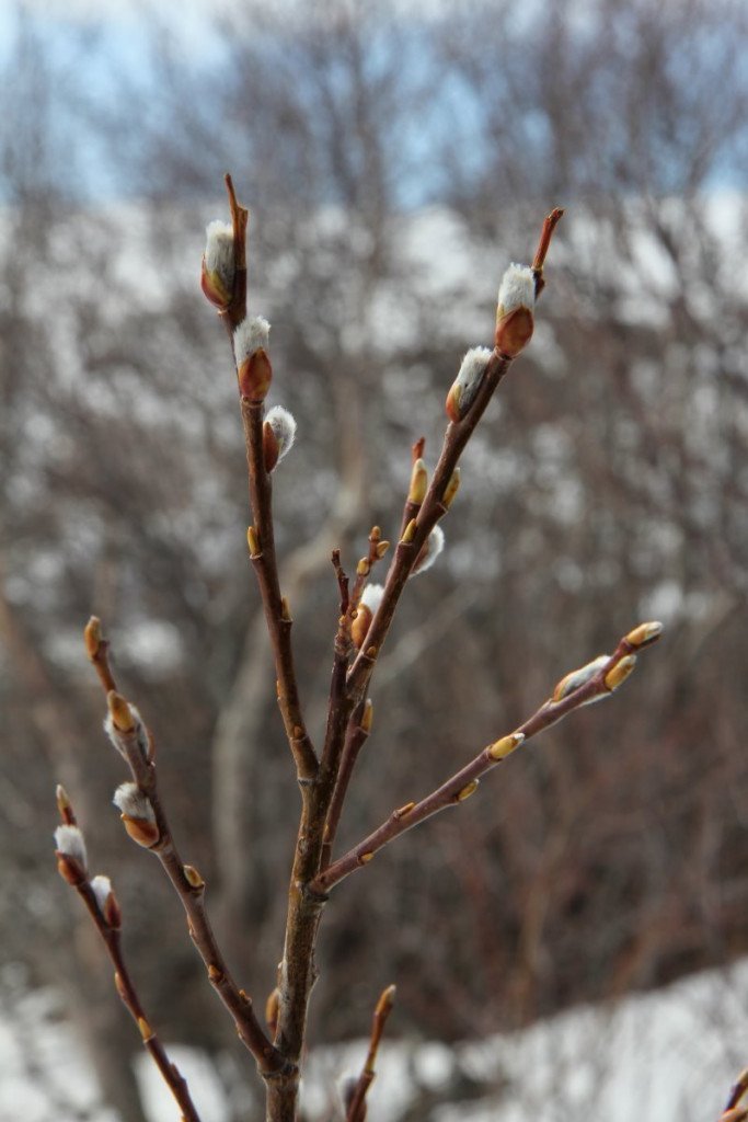 Viðmælendur vefs Skógræktarinnar bentu á að skammt væri liðið á vor og því enn hætta á hretviðrum. Þegar snemma vorar eins og í ár óttast skógræktarfólk alltaf að komið geti hörð frost sem valdi skemmdum á trjágróðri. Við vonum að svo fari ekki og fram undan sé gjöfult ræktunarsumar um allt land. Myndin hér fyrir neðan var tekin í dag, 28. apríl, í Vaglaskógi og þessi gulvíðigrein sýnir að þrátt fyrir snjóinn er skógurinn að vakna til lífsins.