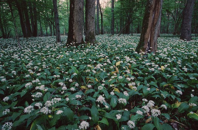 Blómin í skógarbotninum heita bjarnarlaukur, lat. Allium ursinum.