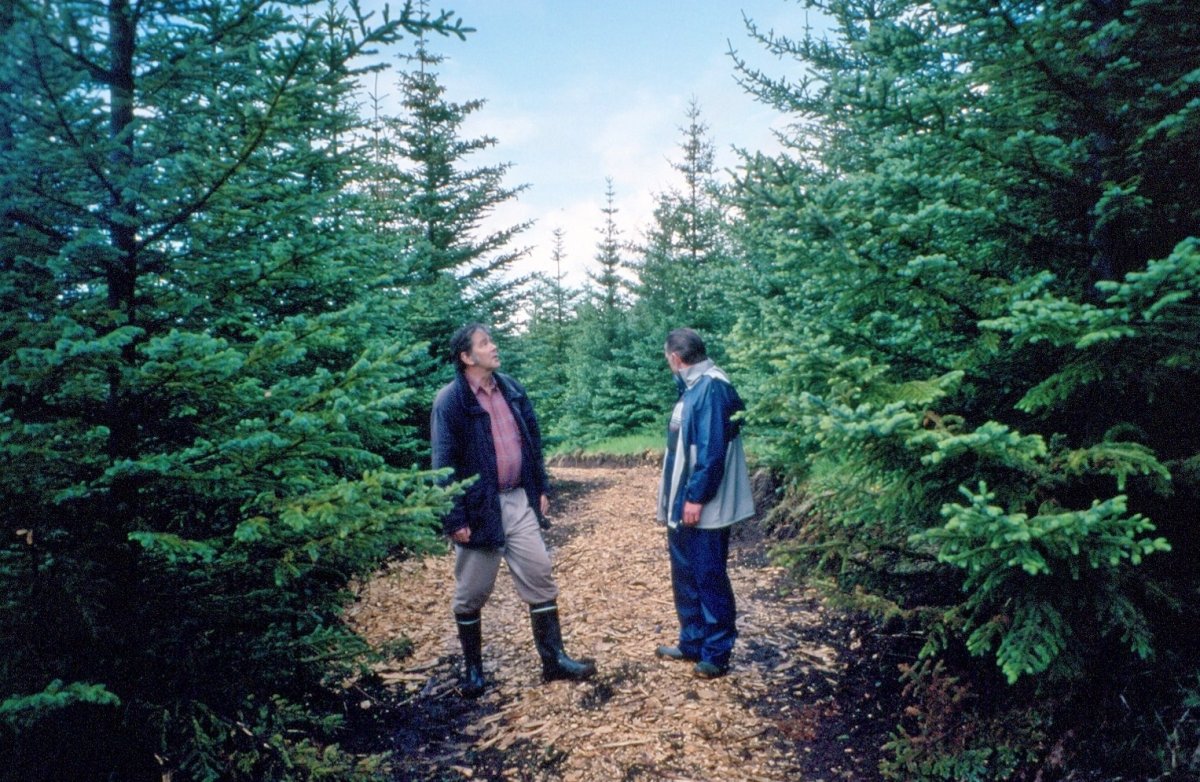 Indriði Indriðason í Tunguskógi sumarið 1994 ásamt Jóni Loftssyni skógræktarstjóra.