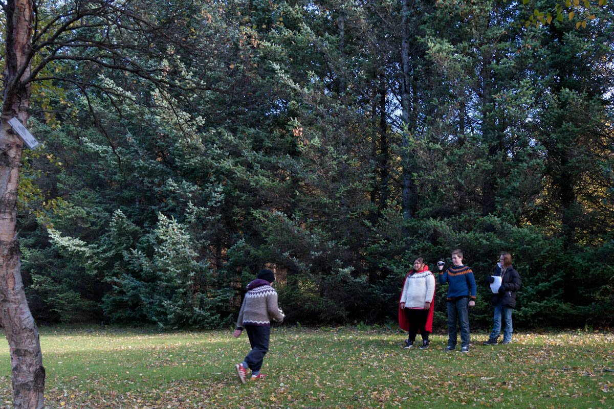 Það var handagangur í öskjunni í skóginum á Mógilsá í gær, 6. október, þegar nemendur í 9. bekk í Langholtsskóla litu þar við. Erindið var árviss ferð þeirra til að kvikmynda Kjalnesingasögu undir stjórn Sæmundar Helgasonar, kennara við skólann. Krakkarnir létu kulda og stífa norðanátt ekkert á sig fá og mynduðu söguna af miklu kappi eins og meðfylgjandi myndir sína.