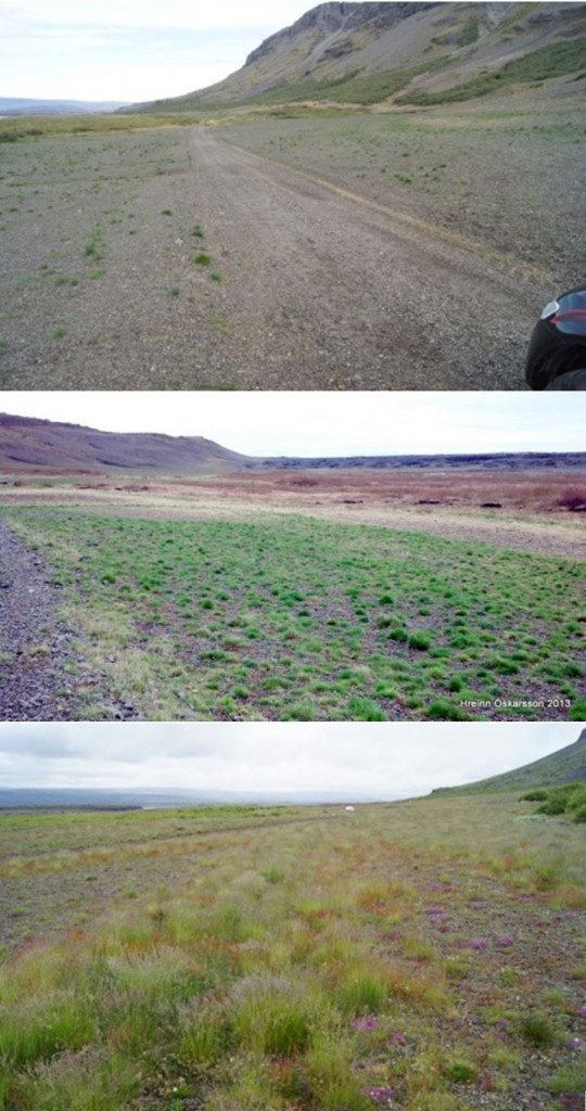 Reykholt í Þjórsárdal í júlí 2014. Þar var dreift kjötmjöli vorið 2013. Svæðið vinstra megin við girðinguna sýnir hvernig landið leit út áður en uppgræðsluaðgerðir hófust.