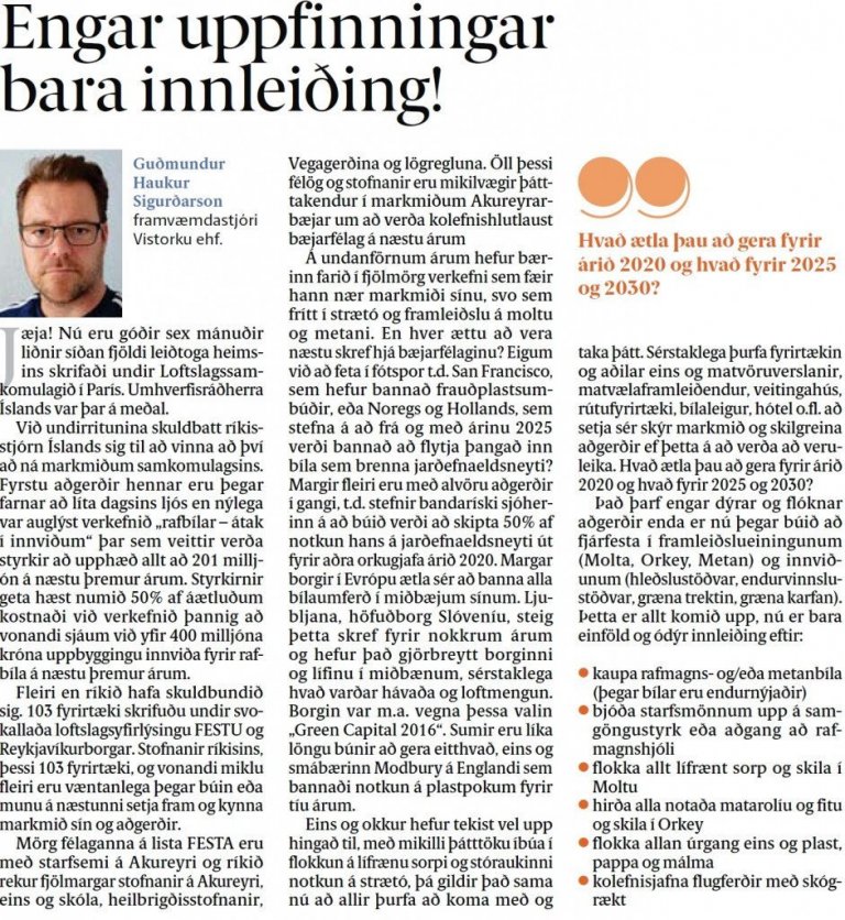 Grein Guðmundar Hauks ber fyrirsögnina „Engar uppfinningar bara innleiðing!“ og hann spyr: „Hvað ætla þau að gera fyrir árið 2020 og hvað fyrir 2025 og 2030?“ Greinin er á þessa leið: