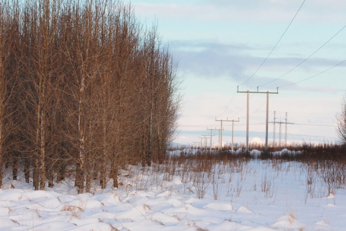 Í verkefninu Mýrvið er mæld öndun lofttegunda að og frá vistkerfi asparskógarins í Sandlækjarmýri í Skeiða- og Gnúpverjahreppi. Myndin er tekin í janúar 2015. Glittir í Jarlhettur í fjarska milli háspennustauranna.
