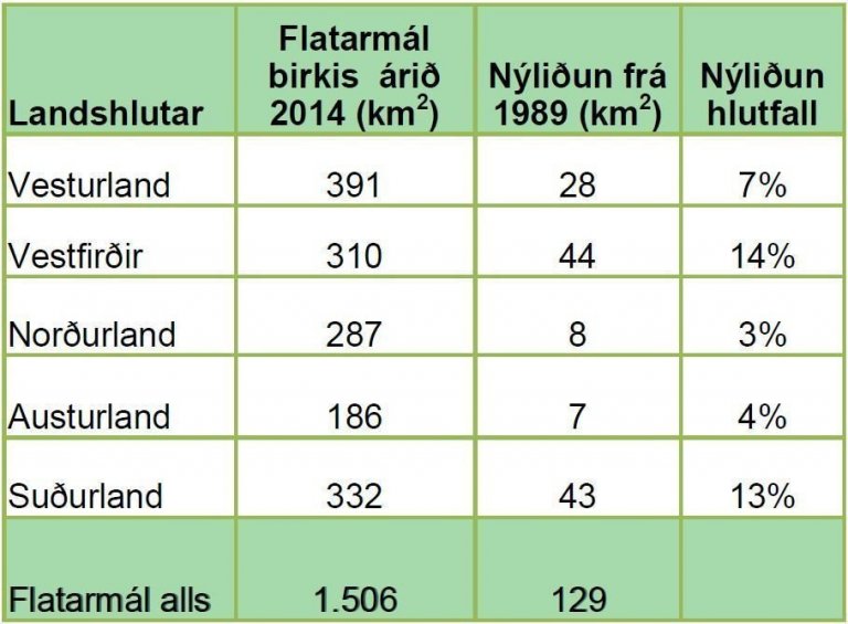 Nú þekur birki 1,5% landsins sem fyrr greinir, eða 1.506 ferkílómetra. Flatarmál þess hefur aukist um tæp 10% frá árinu 1989, alls um130 ferkílómetra. Til viðmiðunar er í takt við eldsumbrotin á hálendinu hægt að nefna að birkiskógarnir hafa samanlagt stækkað frá 1989 um svæði sem er um 50% stærra en hið nýja Nornahraun í Holuhrauni. Nýja hraunið er nú 84-85 km2 að flatarmáli.