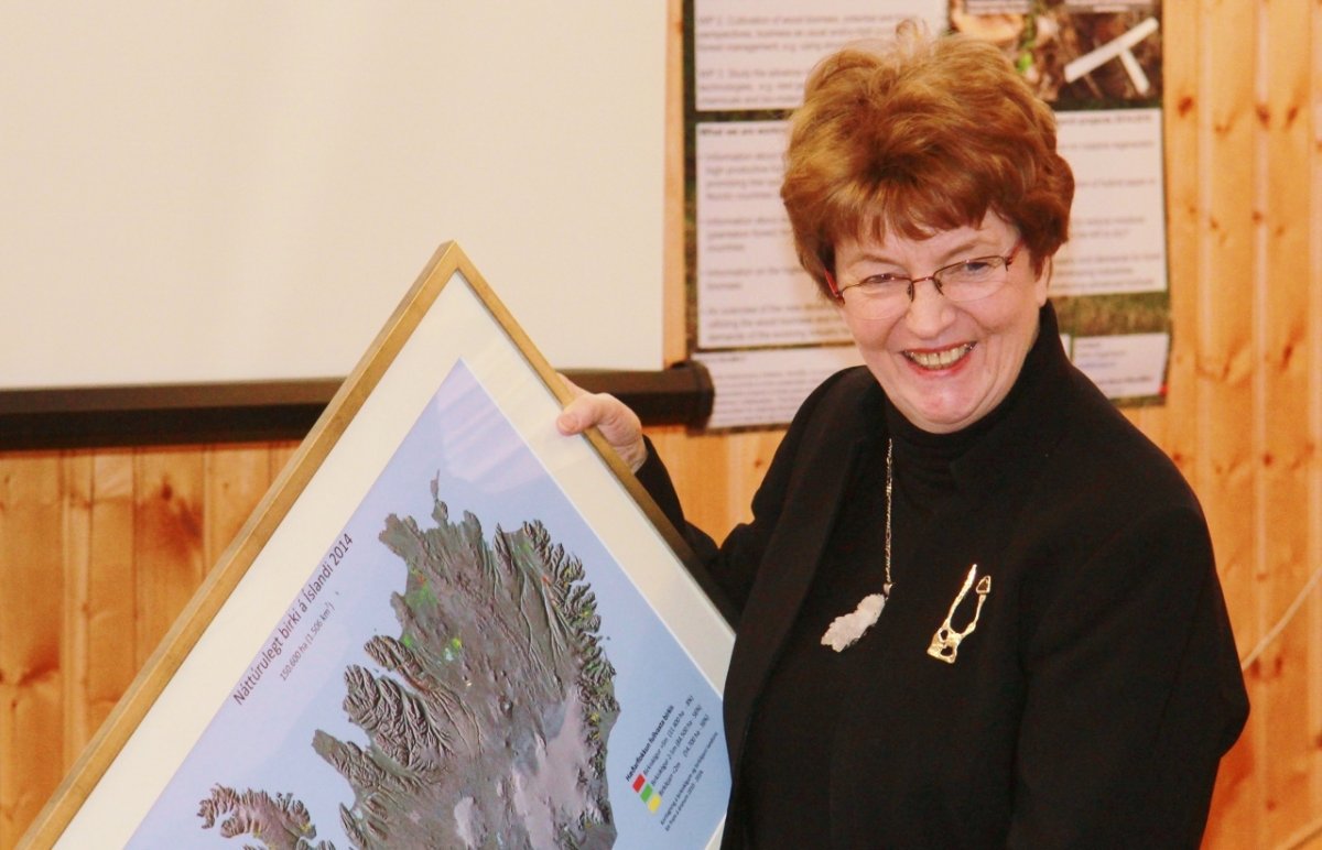 Sigrún Magnúsdóttir umhverfisráðherra með kort sem sýnir útbreiðslu íslenskra birkiskóga eftir birkiskógaúttektina sem lauk 2014.