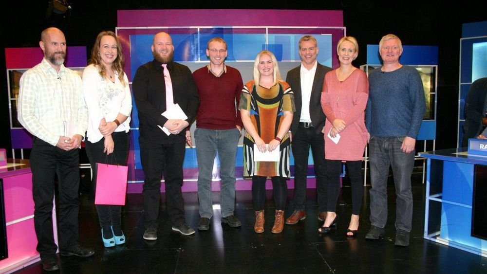 Lið Rangárþings ytra og Strandabyggðar ásamt stjórnendum Útsvars að keppni lokinni. Mynd: Ríkisútvarpið