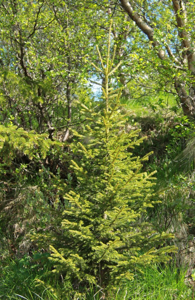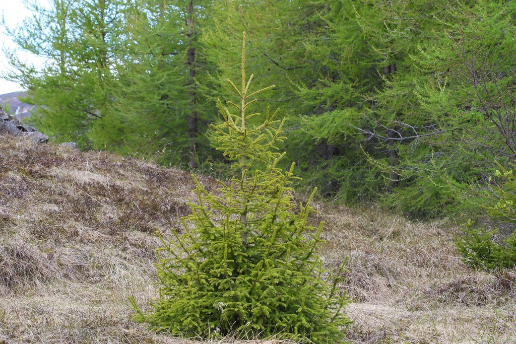 Rauðgreni þrífst vel í skógarskjóli, hér í skjóli lerkis. Ljósmynd: Pétur Halldórsson