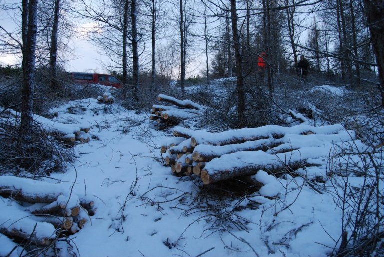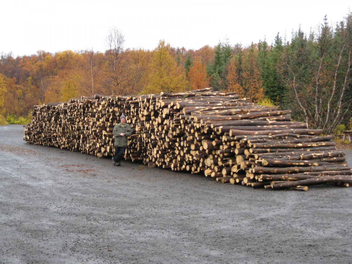 Um fimmtán metra löng og þriggja metra há stæða af furubolum úr grisjun á Vöglum
