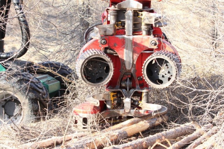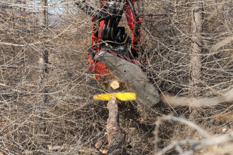 Vélin, sem er af gerðinni GREMO 1050H, afkvistar bolina og sagar þá niður í fyrir fram ákveðnar lengdir. Í þessu tilfelli var ákveðið að neðri hlutinn skyldi sagaður í þriggja metra búta sem væntanalega verða seldir til kurlunar hjá Elkem á Grundartanga. Sá efri og mjórri er sagaður í 180 sm búta sem ætlaðir eru í girðingastaura. Kristján raðar efninu í litla stafla sem síðan þarf að sækja með útkeyrsluvél. Vélin nær tíu metra inn í skóginn þannig að akstursbrautir um skóginn geta verið með allt að 20 metra millibili.