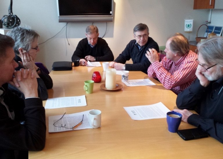Skógræktarfólk á skrafi um 'Emblu'. Frá vinstri: Kristinn H. Þorsteinsson, Þuríður Bachmann, Magnús Gunnarsson, Þorsteinn Tómasson, Þröstur Eysteinsson og Jón Loftsson">