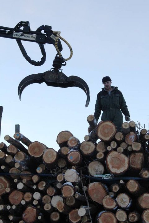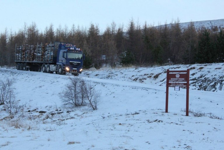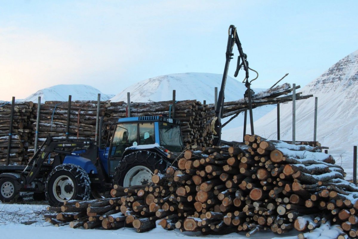 Dráttarvél stendur milli stafla af trjábolum og vöruflutningabíls sem er nær fulllestaður af bolum. Verið að hífa kippu af bolum yfir á bílinn í björtu vetrarveðri með dálitlum snjó á jörð