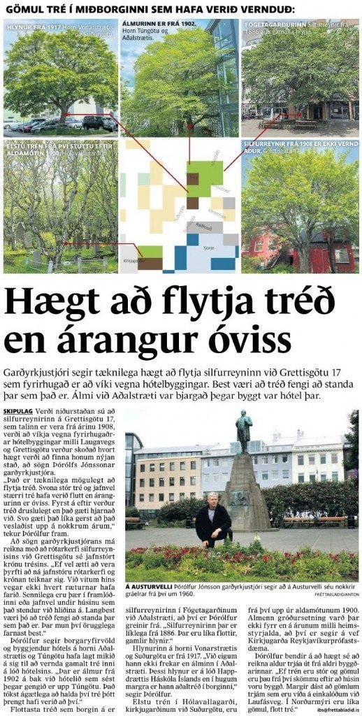 Morgunblaðið segir frá því í miðvikudagsblaði sínu 4. júní að stöðugur straumur fólks hafi verið um Grettisgötu í Reykjavík í gær til að skoða 106 ára gamlan silfurreyni sem staðið hefur til að fjarlægja vegna byggingaframkvæmda. Um 2.000 manns hafi skrifað undir mótmæli gegn framkvæmdinni. Þetta er til marks um að fólk sjái verðmæti í myndarlegum trjám í þéttbýli. Fréttablaðið fjallar líka um tréð og möguleikanum á að flytja það sem háður sé nokkurri óvissu. Blaðið sýnir myndir af trjám í miðborg Reykjavíkur sem hafa verið vernduð. Umræðan um gömul tré í þéttbýli er af hinu góða.
