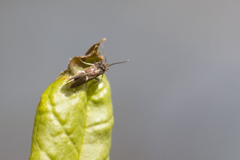 Birkikembufiðrildi. Efst á síðunni er mynd af lirfu í laufblaði. Myndir: ESO