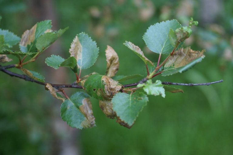 Ef ágangur birkikembunnar er mikill geta skemmdirnar orðið áberandi úr fjarlægð.