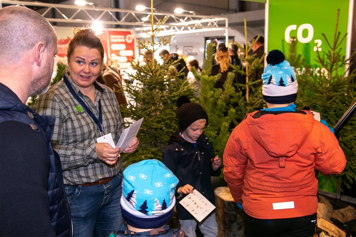 Helena Marta Stefánsdóttir, sérfræðingur og skógræktarráðgjafi, tekur á móti fjölskyldu í bás Skógræ…